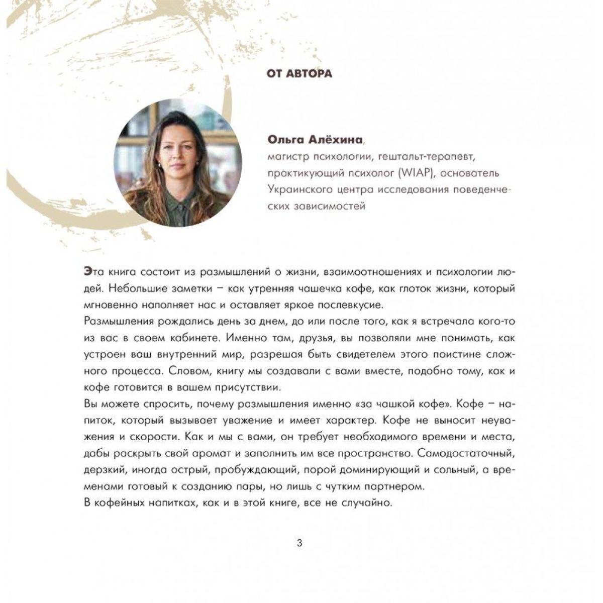 «Роздумай за чашкою кави» про людські відносини, психологію, життя і в чому іншому. Шкіра її сторінка – як ковток запашної кави, який наповнює силами, пробуджує, дарує справжнє насолоду. У книжці зібрані роздуми магістра психології, гештальт-терапевта, психолога-практика Ольги Альохіної.
