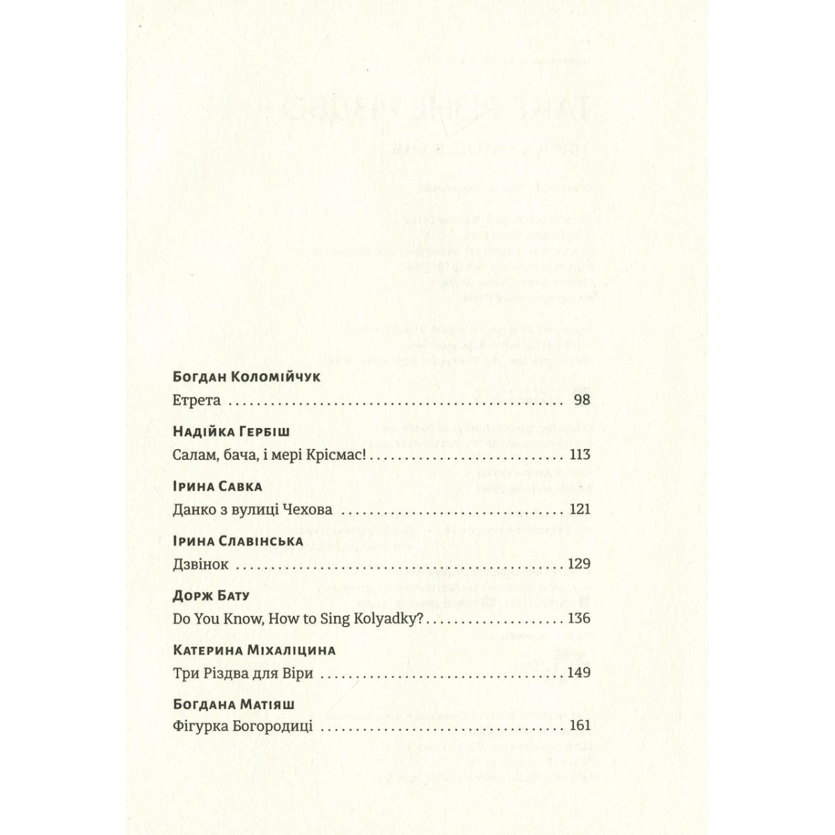 До книги увійшли історії від таких авторів: Катерина Бабкіна, Дорж Бату, Христя Венгринюк, Надійка Гербіш, Богдан Коломійчук, Богдана Матіяш, Дзвінка Матіяш, Василь Махно, Катерина Міхаліцина, Костянтин Москалець, Ірина Савка, Ірина Славінська, Людмила Таран, Петро Яценко. Упорядниця Ольга Ренн.