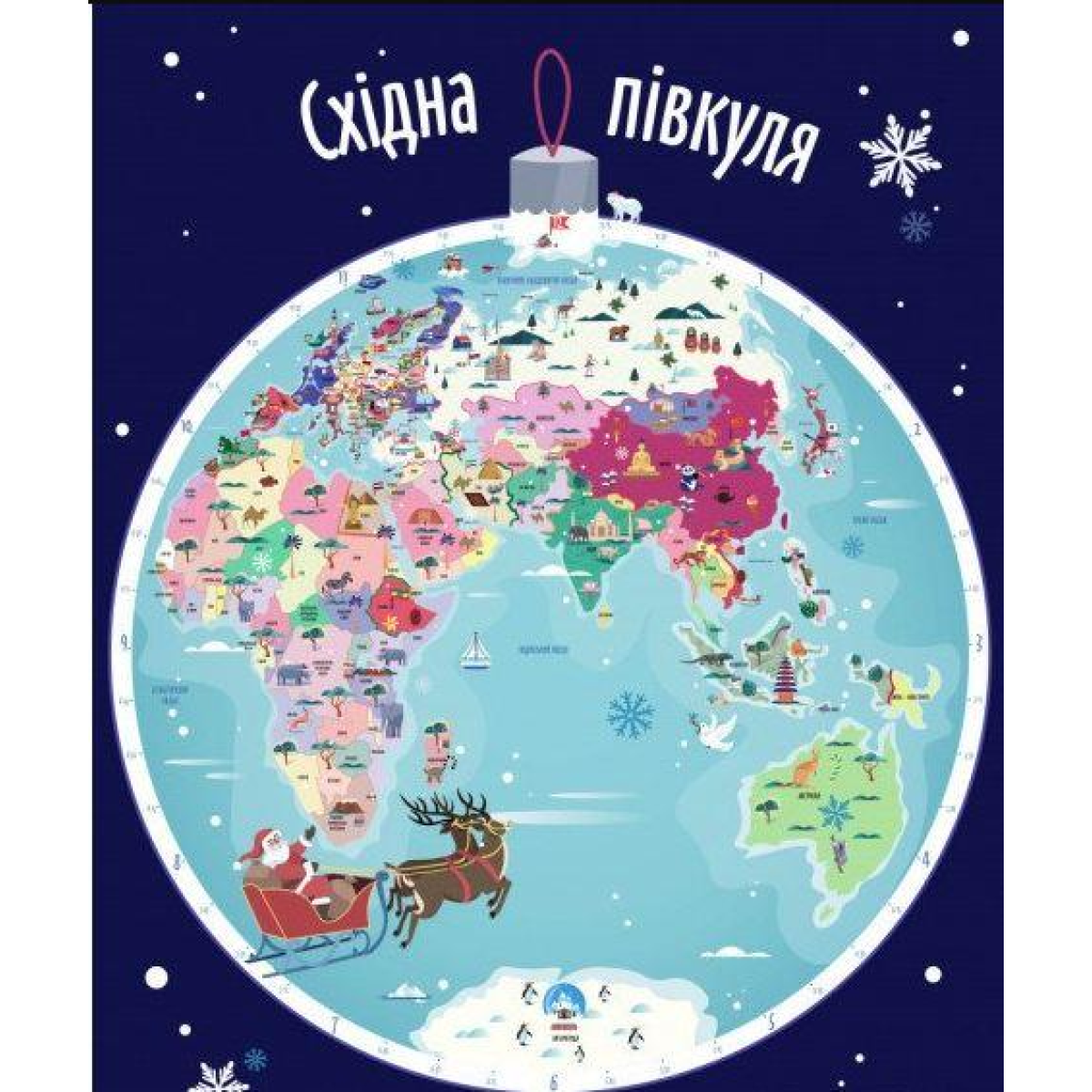 - карта світу, подана у вигляді Східної та Західної півкуль Землі — величезних ялинкових іграшок;