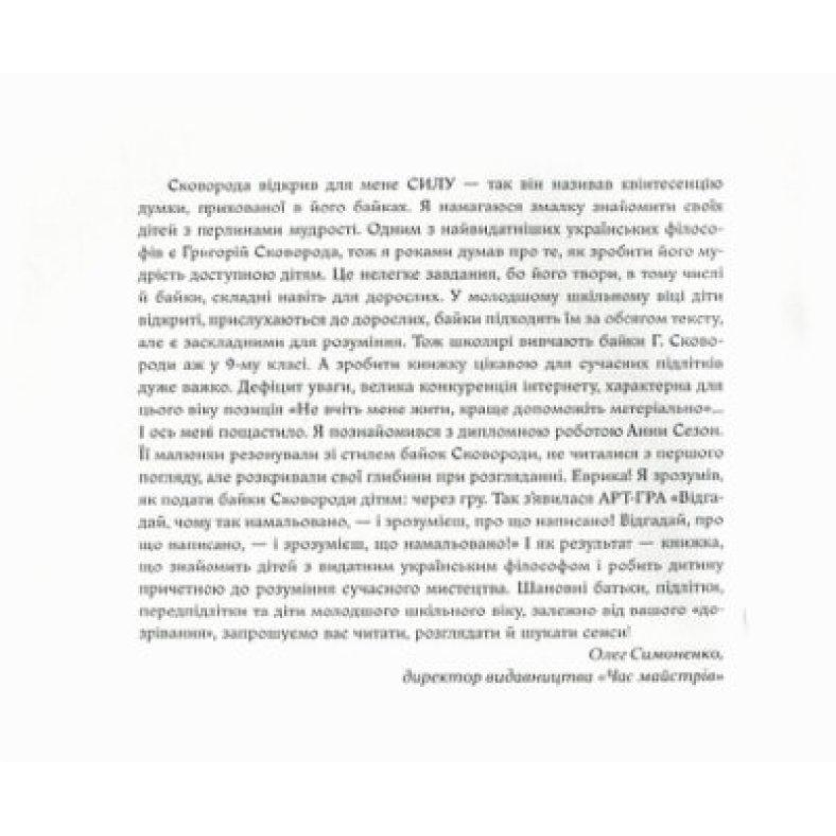 Краще дітям від Григорія Сковороди! Збірка містить вибрані байки Григорія Сковороди в переказі Олександра Виженка і малюнках-загадках Анни Сезон. Видання призначене для широкої аудиторії: від молодших школярів до їхніх батьків. Ця книжка — не просто ілюстрована збірка байок. Це артбук, малюнки в якому незвичні, не завжди зрозумілі й подекуди абстрактні, але вони надають давнім реаліям новітньої форми і разом з ними стають цікавинкою для сучасних дітей. Як байки Григорія Сковороди приховують у собі мудрість, так і малюнки Анни Сезон приховують у собі загадки і спонукають розгадати таємниці їхніх образів. Ілюстрації шокують читача, бентежать, веселять, можуть навіть і обурювати — і саме це дає поштовх до пізнання, розпалює бажання їх зрозуміти. Тексти Сковороди в оригіналі непрості навіть для дорослих. Ми спрощуємо їх сприйняття, зберігаючи авторський стиль і цілісність завдяки переказу письменника, казкаря та філософа Олександра Виженка, який два десятки років досліджував життя і творчість Григорія Сковороди, а завдяки ілюстраціям-загадкам перетворюємо читання байок на дитячу гру. У цій арт-грі ми змінюємо орієнтири, відкриваємо нові світи для вас і вашої дитини. Кожна гра містить 4 частини: байку, малюнок, силу байки та підказку до малюнка від художниці. Шановні батьки, підлітки та діти молодшого шкільного віку, залежно від вашого «дозрівання», запрошуємо вас читати, розглядати й шукати сенс! Девіз: Пропонуємо вам ноу-хау в літературі для дітей: пізнання через АРТ-ГРУ! Сковорода — це сила. Зробіть його частиною мисленого простору своєї дитини!