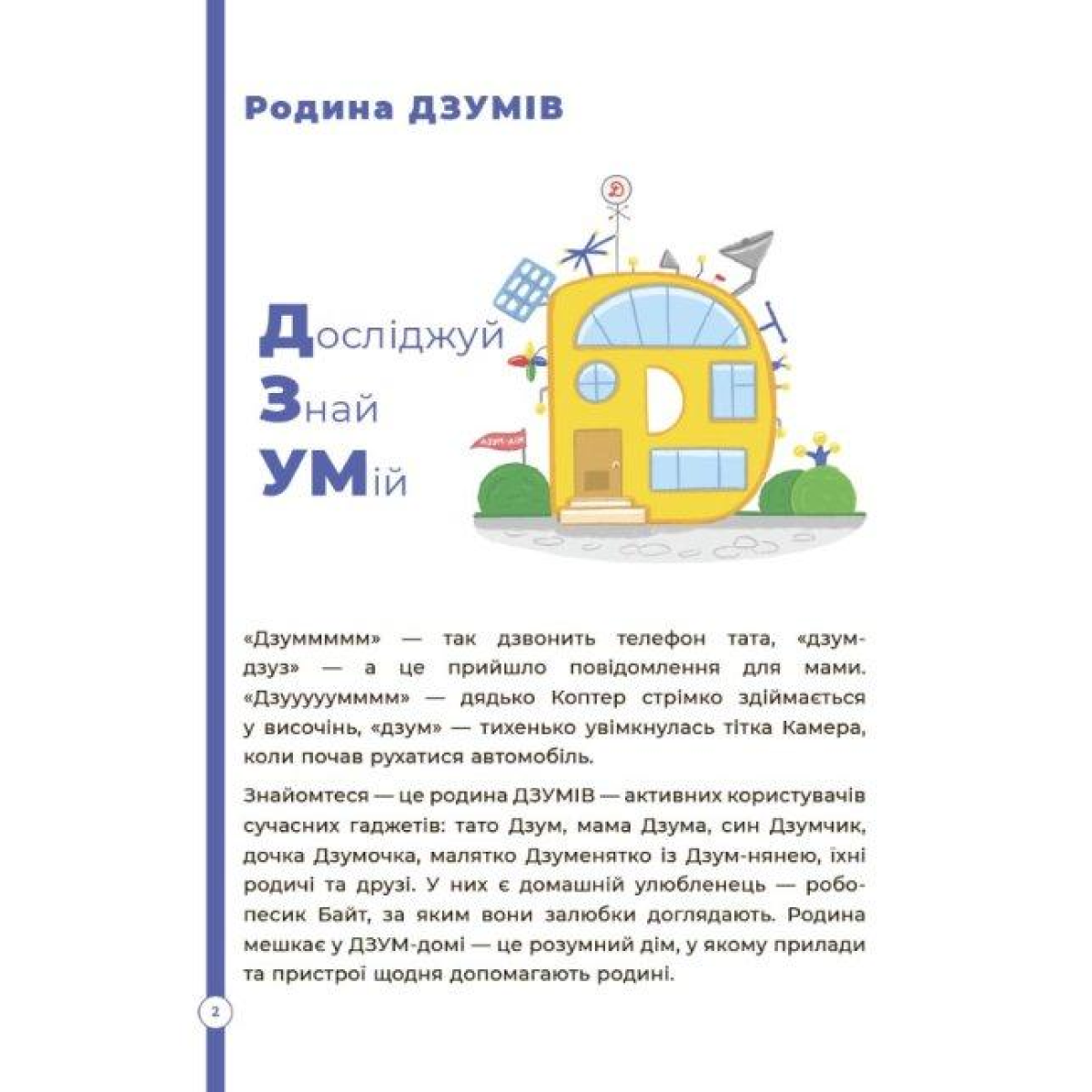 Дитина з розвиненим логічним мисленням вирізняється з-поміж інших. Вона легко вчиться, знаходить різні шляхи розв’язання задач, уміє обґрунтовувати свою думку. Та й взагалі, усе, що відбувається довкола неї,— цікаве й зрозуміле! Нумо розвивати логічне мислення дитини разом із родиною ДЗУМІВ, які живуть у сучасному світі поруч із такими незвичними родичами як: Комп-дідусь, Бабуся Флешка, Дядько Коптер, Тітка Камера та іншими друзями-гаджетами.