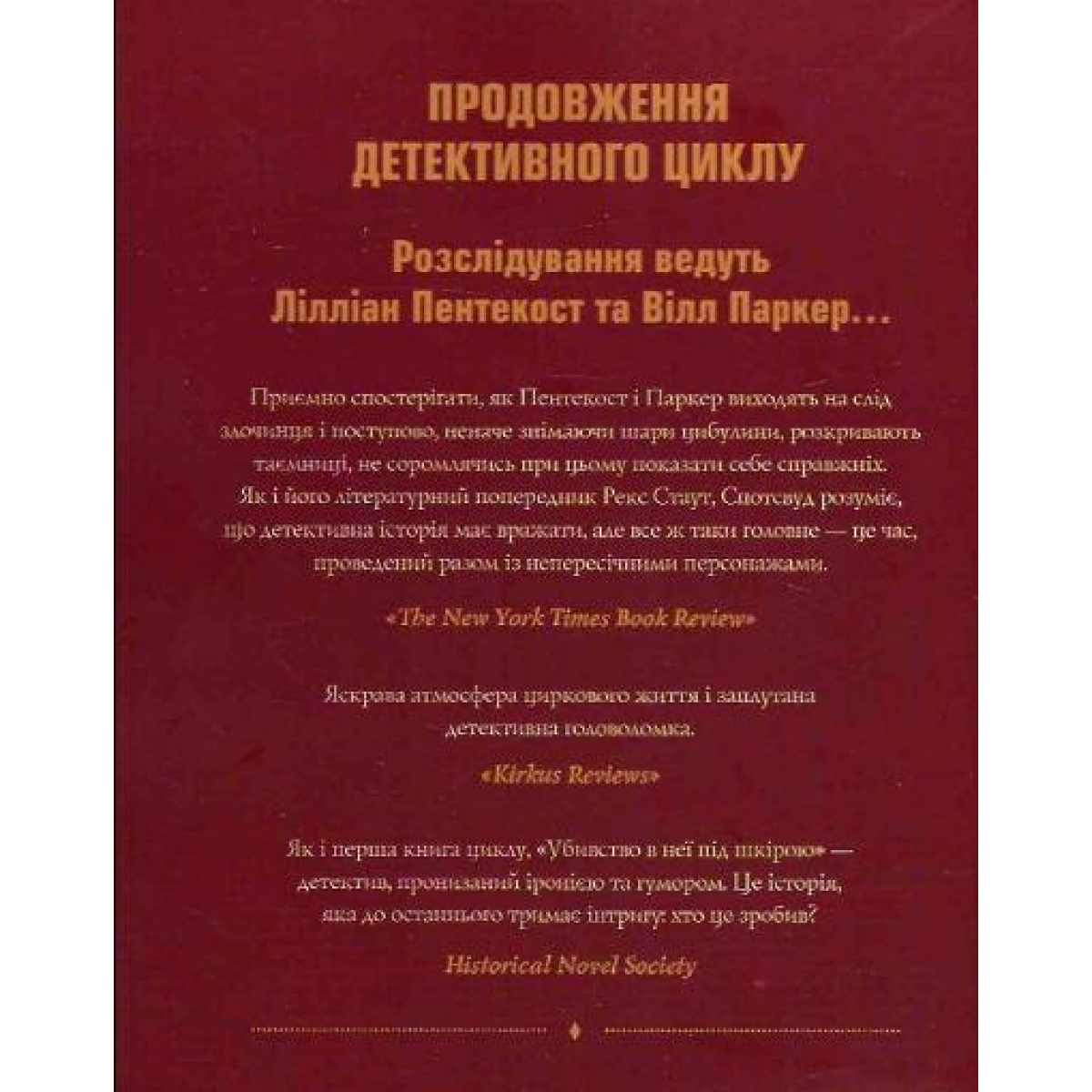 Немає підозрюваних і доказів, загадкові послання від сучасників — і ніби цього мало, все ускладнює ще й закоханість Вілл, через яку вона може стати наступною ціною. Роман є першим українським переведенням із майбутнього циклу книг про розслідування, що ведуть Пентекост і Паркер.