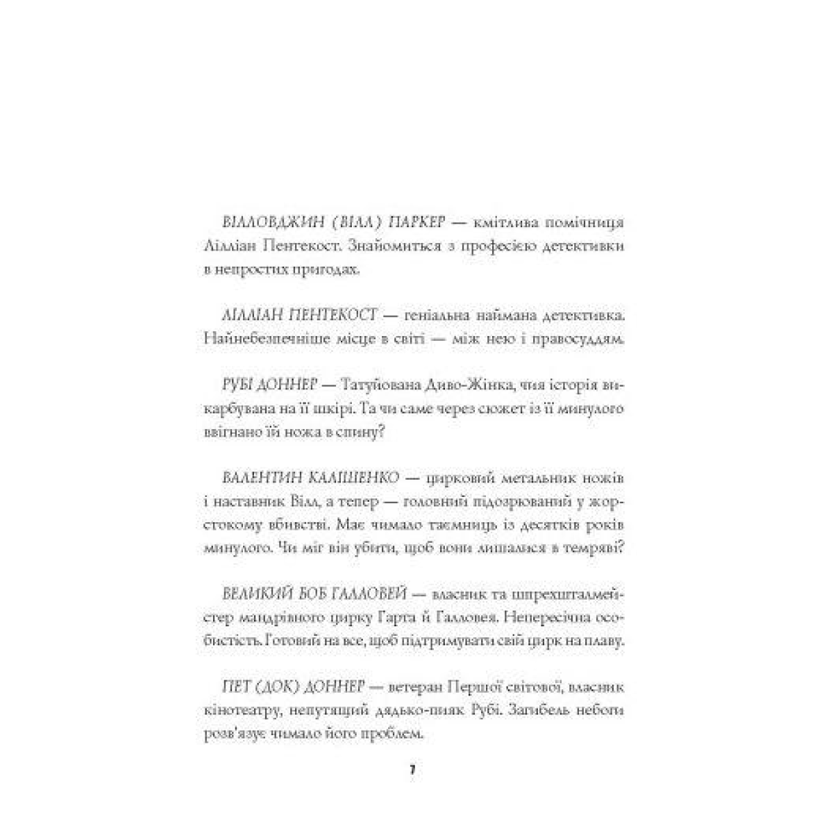 На згадку про гучну справу з кришталевою кулею у Вілл Паркер залишилися шрами не тільки на обличчі, але й на серці. Тож вона пообіцяла собі більше ніколи не змішувати особисте з професійним. Однак відмовити у допомозі колишньому роботодавцю, власнику цирку Гарта й Галловея, не змогла. Хтось устромив ножа у спину Рубі Доннер, відомій під сценічним ім’ям Татуйована Диво-Жінка. Цирк був справжньою домівкою для Вілл, а Рубі — близькою подругою. Та головне, що підозрюваний у цій справі — цирковий наставник Паркер, якому вона багато чим завдячує, зокрема і вмінням прицільно метати ножі. У пошуках вбивці Вілл Паркер та її шефиня, відома детективка Лілліан Пентекост, вирушають у маленьке містечко на півдні, де гастролює цирк. За лаштунками, в минулому артистів і навіть під численними татуюваннями жертви приховано багато таємниць — і кожна запросто могла стати мотивом для вбивства.