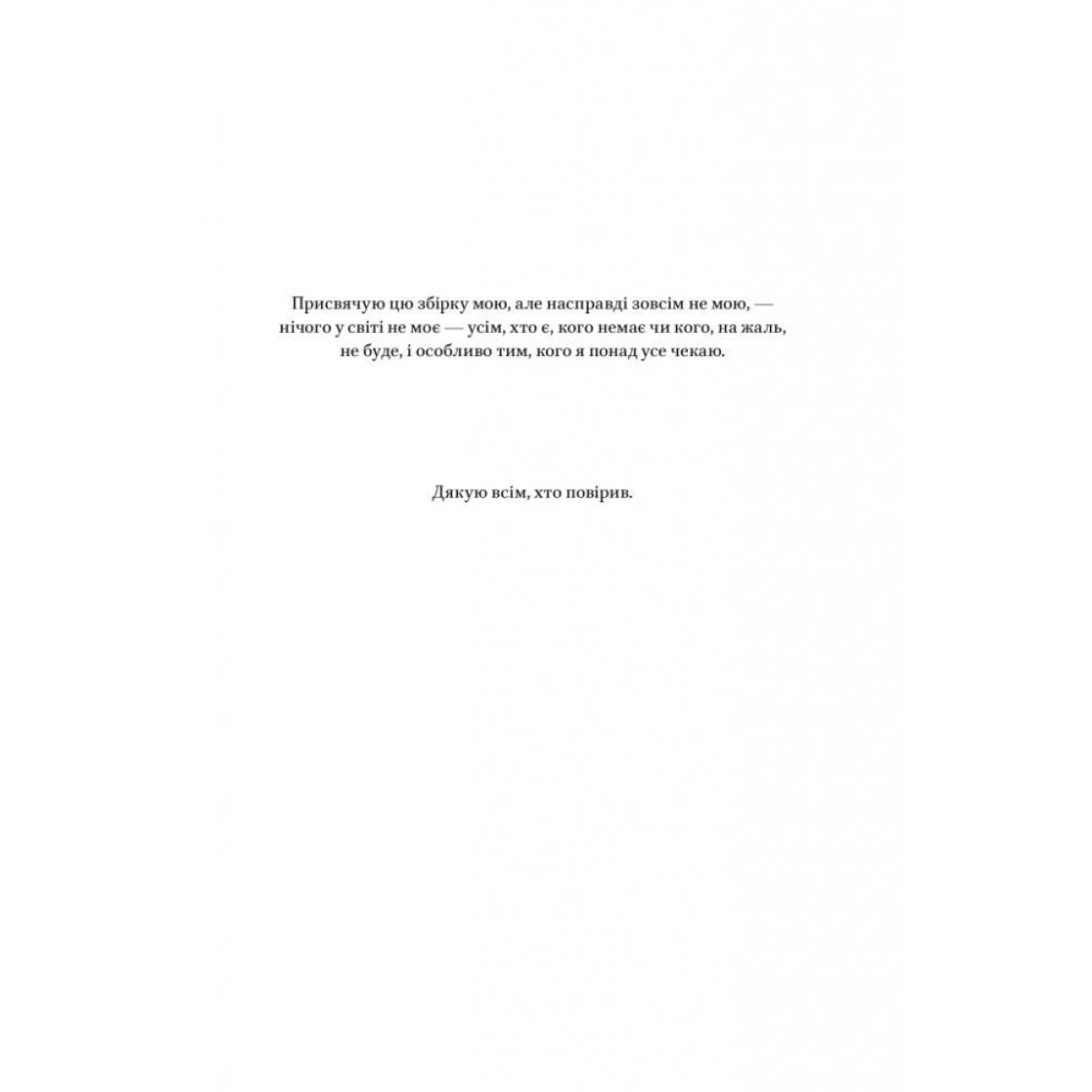 Прочитайте ці вірші. Побудьте поруч. Зіпріться на обвалену стіну. Подихайте сирістю й порохом. Послухайте, як співають птахи на початку весни і працює ворожа техніка на дванадцяту годину. А тоді підійдіть до бійниці — й дивіться. Як курява ковтає будинки. Як рвуться сталеві нитки снарядів. Як стираються вулиці, наче коректором. Як пострибунчик сонця падає додолу. Як вигинається трава після того, як по ній пройшла група піхотинців. Як дідусь тягне велосипед і зникає в тумані. Мусимо побачити дерева і гори, сніги і ріки, любов. І дихати, бо це сьогодні розкіш. Покажіть собі себе. Те, скільки цукру ви кидаєте собі в чай. Як смажите картоплю. Як жмуритесь від сонця. Як високо закачуєте шкарпетки. Чи зіжмакуєте паперовий стаканчик перед тим, як кинути його до смітника. Ця бійниця широка. І вона — лише ваша. Варто тільки зазирнути. Не бійтеся.