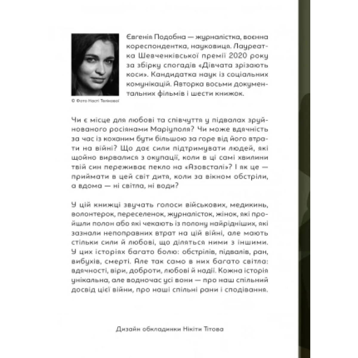 Чи є місце для любові та співчуття у підвалах зруйнованого росіянами Маріуполя? Чи може вдячність за час із коханим бути більшою за горе від його втрати на війні? Що дає сили підтримувати людей, які щойно вирвалися з окупації, коли в ці самі хвилини твій син переживає пекло на «Азовсталі»? І як це — приймати в цей світ дитя, коли за вікном обстріли, а вдома ні світла, ні води? У цій книжці звучать голоси двадцяти п’яти жінок — військових, медиків, волонтерок, переселенок, журналісток, — жінок, які пройшли полон або які чекають із полону найрідніших, які зазнали непоправних втрат на цій війні, але мають стільки сили й любові, що діляться ними з іншими.