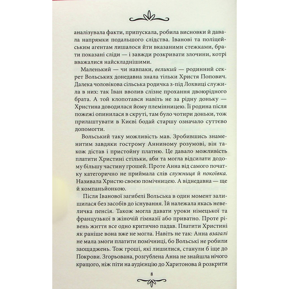 Любов затьмарює розум. У цьому переконується Анна Вольська, дізнавшись про закоханість Христі, своєї відданої помічниці. Анна підозрює, що на недосвідчену дівчину полює задля забави цинічний світський спокусник. Однак незабаром викритий залицяльник сам стає жертвою київських вампірів — так охрестив таємну спільноту друг Анни, репортер Гліб Коваленко. Анна починає розслідування — і вже перший крок ставить її разом із командою поза законом. Чому київська поліція гальмує слідство? Як слуги закону пов’язані з ритуалами тих, кого називають вампірами? І невже ці ритуали не злочин, а прогресивні для початку ХХ століття медичні практики? Це лише частина запитань, на які шукають відповідей сищики-аматори. До того ж небезпечне слідство ще більше зближує молоду вдову Анну і Гліба, який давно не приховує своїх почуттів до неї...