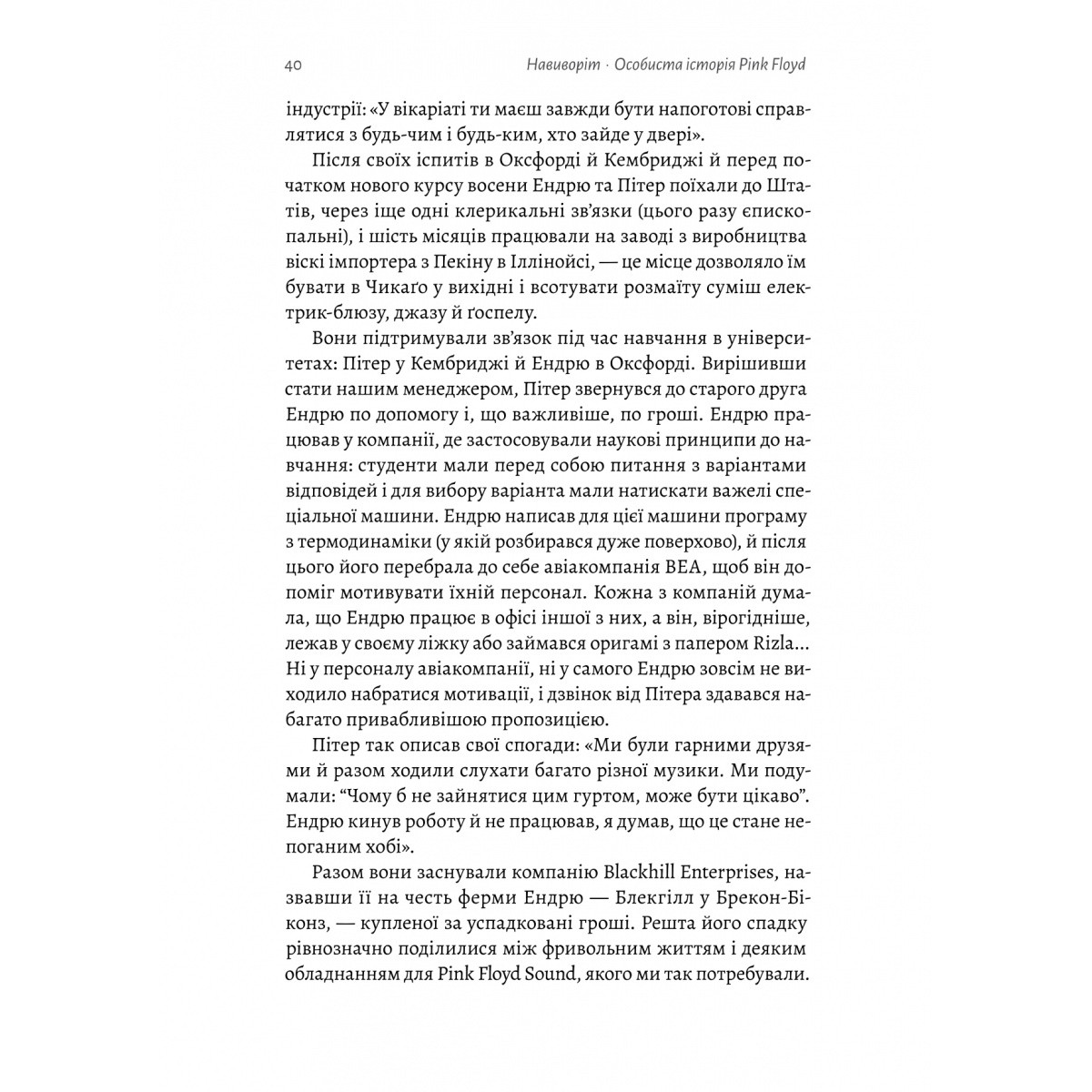 Pink Floyd — вичерпна історія одного з найвидатніших гуртів світу від учасника-засновника Ніка Мейсона Після року в лондонському андеграунді, експериментуючи з революційними технологіями, Pink Floyd випустили свій перший сингл. А вже через кілька років відбувся їх стрімкий злет: перший альбом The Dark Side of the Moon тримався в чартах до 1982 року (найдовше з усіх альбомів, що коли-небудь безперервно перебували в чартах) і став одним з найбільш продаваних альбомів усіх часів; Wish you were here досягнув культового статусу, а The Wall став номером один ледь не в кожній країні світу. Однак через десятиліття шалених музичних звершень між учасниками гурту стався розкол, який вилився у судові позови. І лиш нещодавно, на початку нового тисячоліття, відбулося омріяне фанами примирення, яке й дозволило учаснику-засновнику Ніку Мейсону написати власний внутрішній погляд на їхню історію. «Навиворіт» — це не просто історія гурту, який став музичною легендою. Це емоційна сповідь з перших вуст — шлях музичного мистецтва крізь безповоротні втрати, нові релізи і розколи, до впливу на успіх цифрових технологій і соціальних мереж.