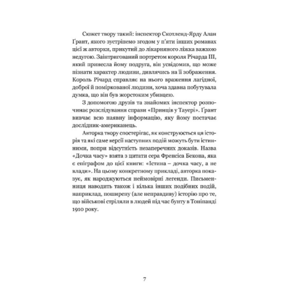 Герой роману Жозефіни Тей детектив Алан Ґрант тимчасово прикутий до ліжка і знемагає від нудьги. Йому випадково потрапляє до рук зображення людини, яку він «посадив би в крісло судді». Прочитавши на звороті, що це – портрет Річарда ІІІ, Ґрант спантеличений. Адже всім зі шкільних років відомо, що цей король убив двох своїх племінників. Не міг же ж він так помилитися! Алан Ґрант починає розслідування. Його, як детектива, цікавлять тільки факти. Але «свідки» суперечать один одному. Історію пишуть переможці, а істина – «дочка часу». Тож хто має рацію: детектив чи безсумнівний авторитет – «святий» Томас Мор?